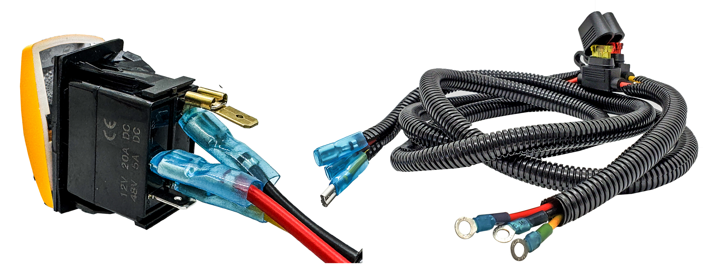 Simply connect your LED lights' power wire directly to the rear spade terminals on the rocker switch, connect the terminal rings to the power distribution block, and you’re ready to light up the trail. This kit includes built-in dual fuse protection—a 10A fuse for ignition power and a 20A fuse for constant power—ensuring safe, reliable operation in demanding off-road conditions.