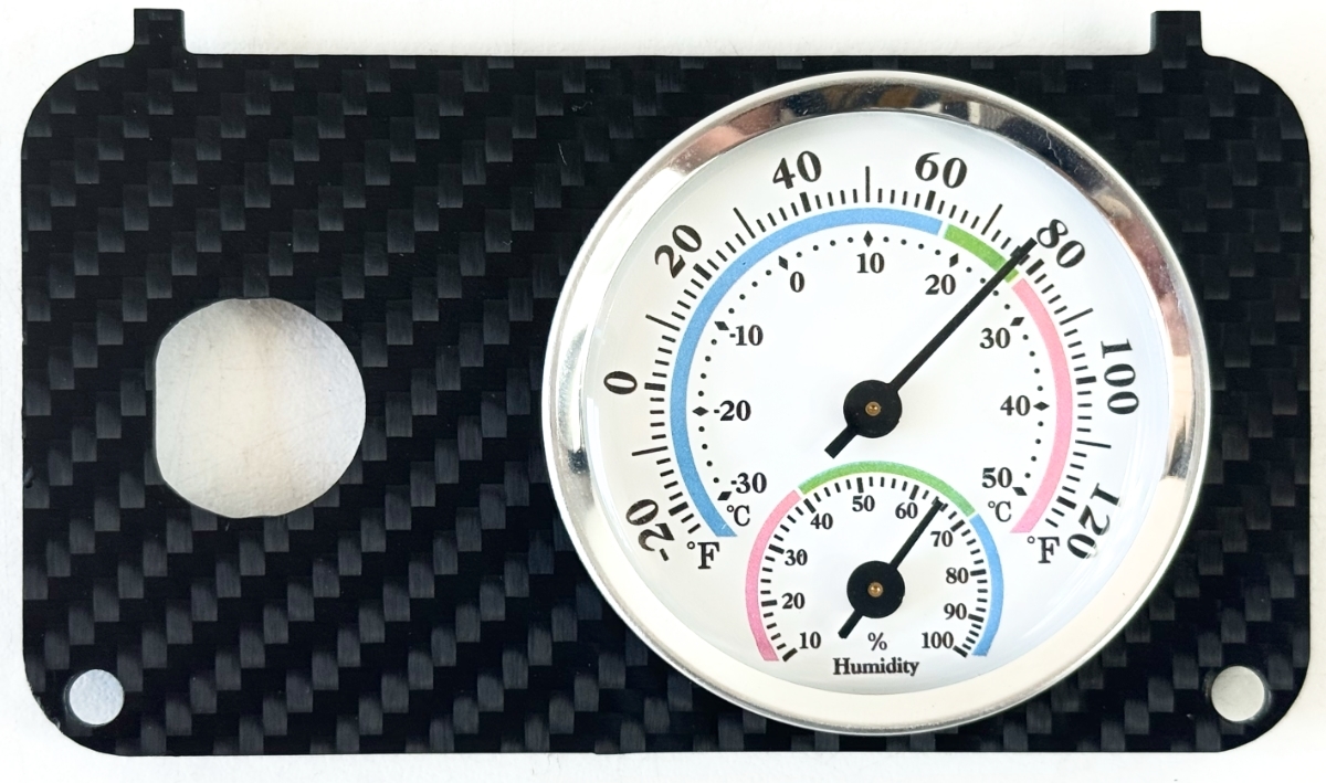 Upgrade your golf cart’s dash with this premium carbon fiber key switch plate featuring a built-in analog thermometer - hygrometer. Designed to replace key switch panel this upgrade adds a rugged, high-performance look with a thermometer.
